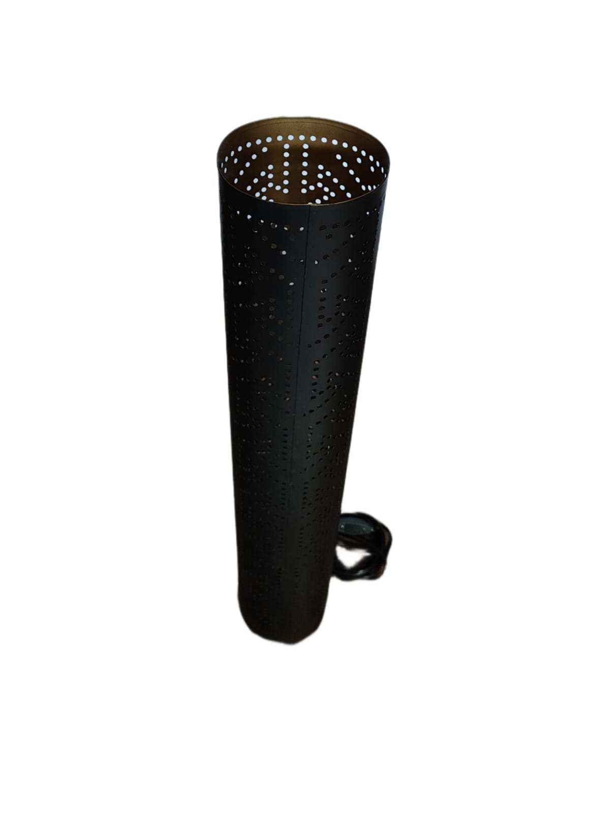 This is a modern floor lamp; it is convincing with its wonderful decorative punches on the lampshade. Through these, the light is reflected enchantingly. The black elongated textile shade has a diameter of 15cm, and the inner shade is gold-colored